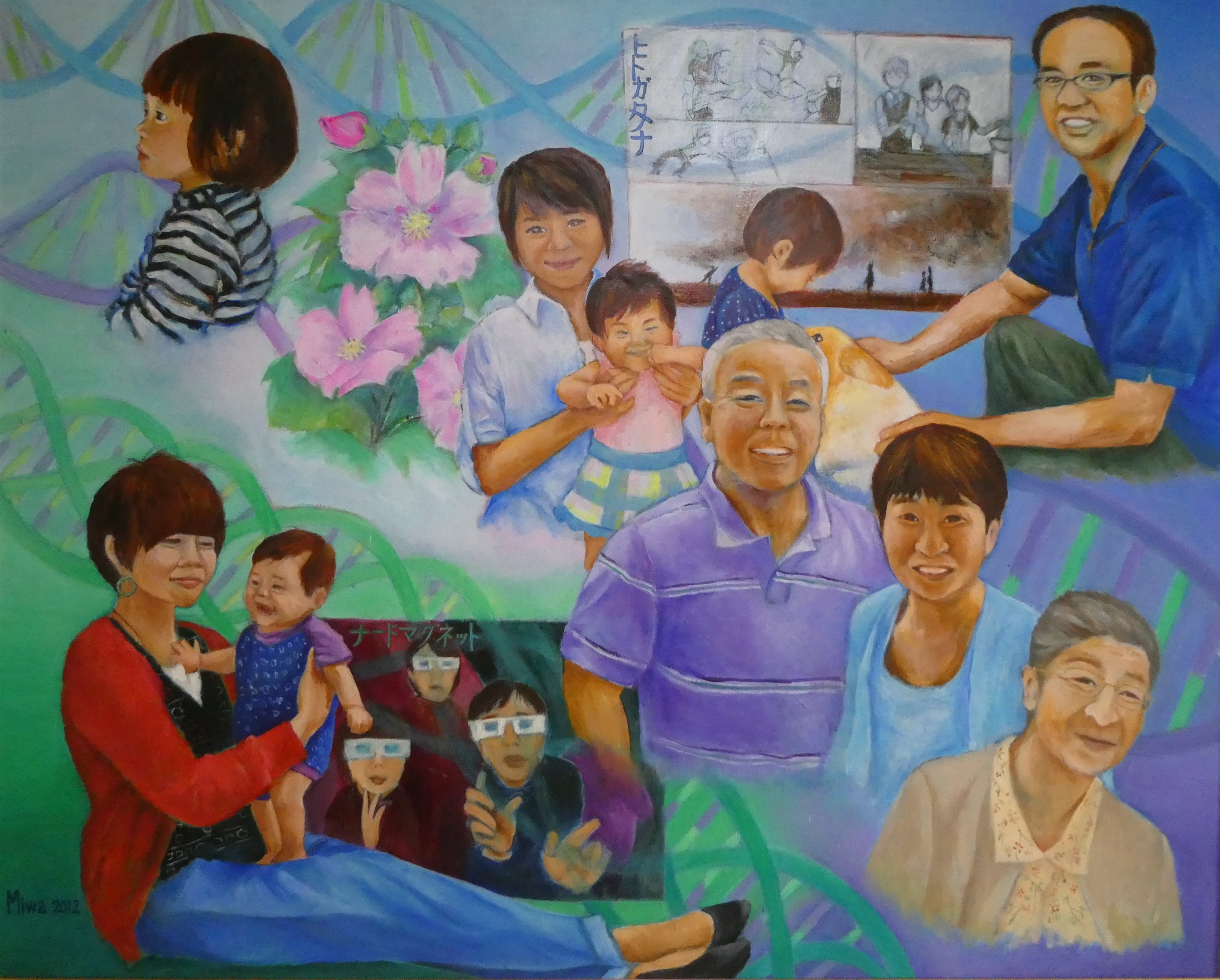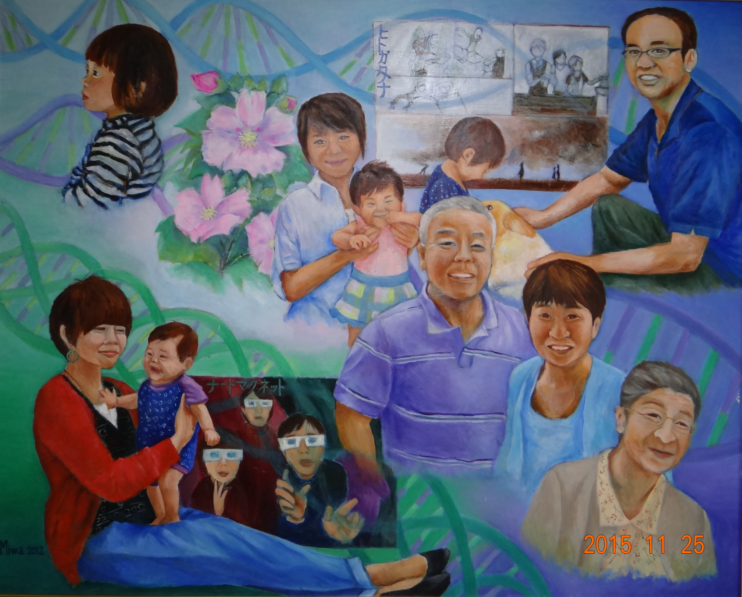 DNAの二重らせん背景に、夫婦・子供たち・孫そして母を愛情込めて描く(県展応募)。