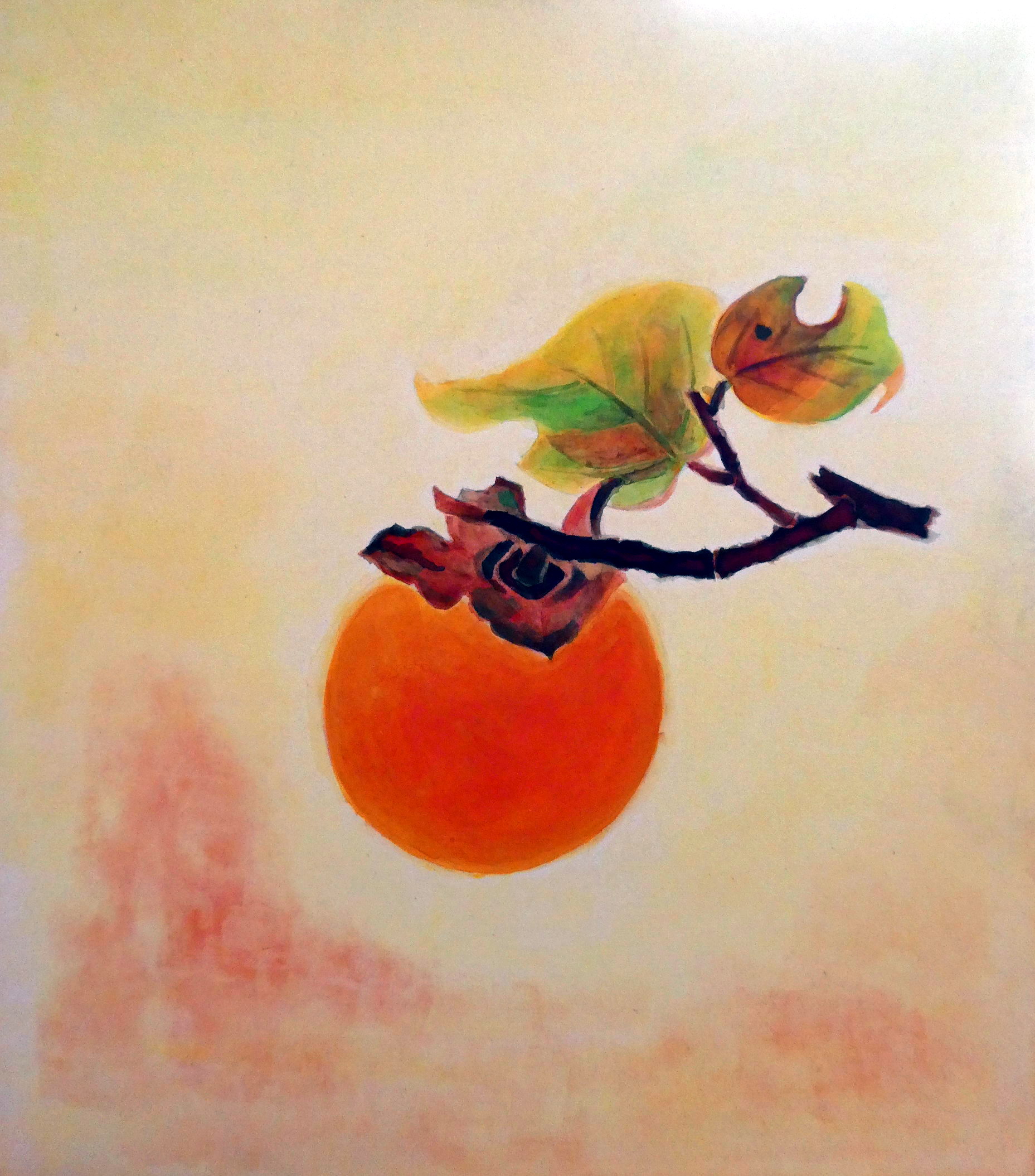「すみれ」と同じく日本画にトライした習作の「柿」。定番の題材だが柿や葉の色彩に試行錯誤を繰り返したようで同じテーマの習作が他にも遺されていた。<2012年>