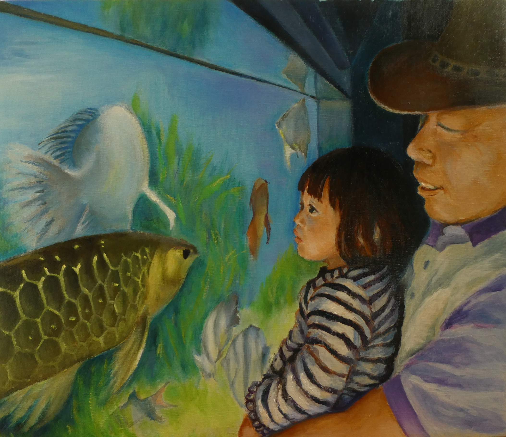 白浜水族館でアマゾン生息の巨大魚に見入る孫と祖父。美和ちゃんが師事する画伯に弔問頂いた折、リビング壁面に飾った作品群の中でこの絵を褒めちぎってもらった。それだけで嬉しい。<2012年>