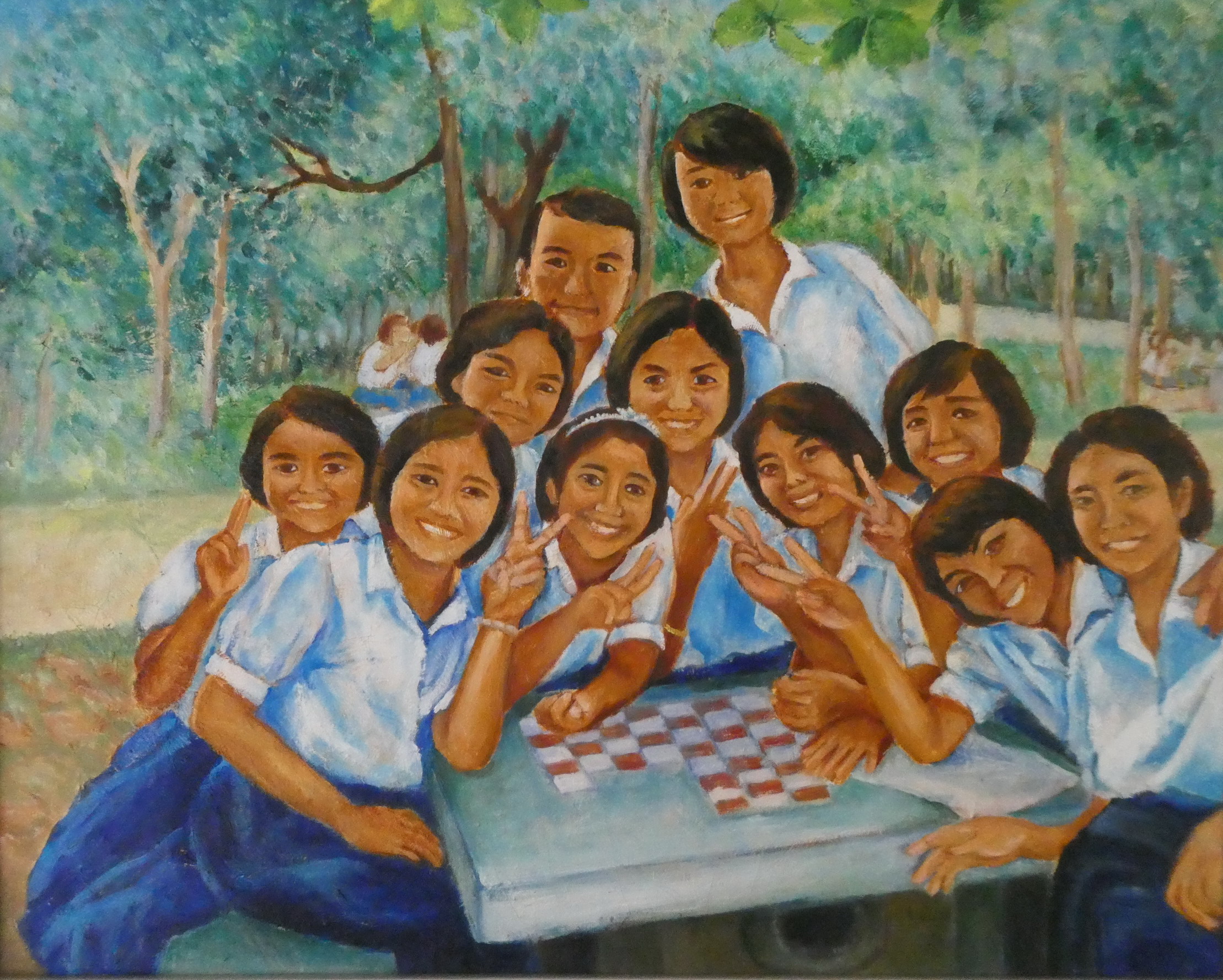 美和がタイのスリン市に、現地学校の日本語教師として短期滞在したときの生徒たちの微笑ましい集合シーン(県展応募)。